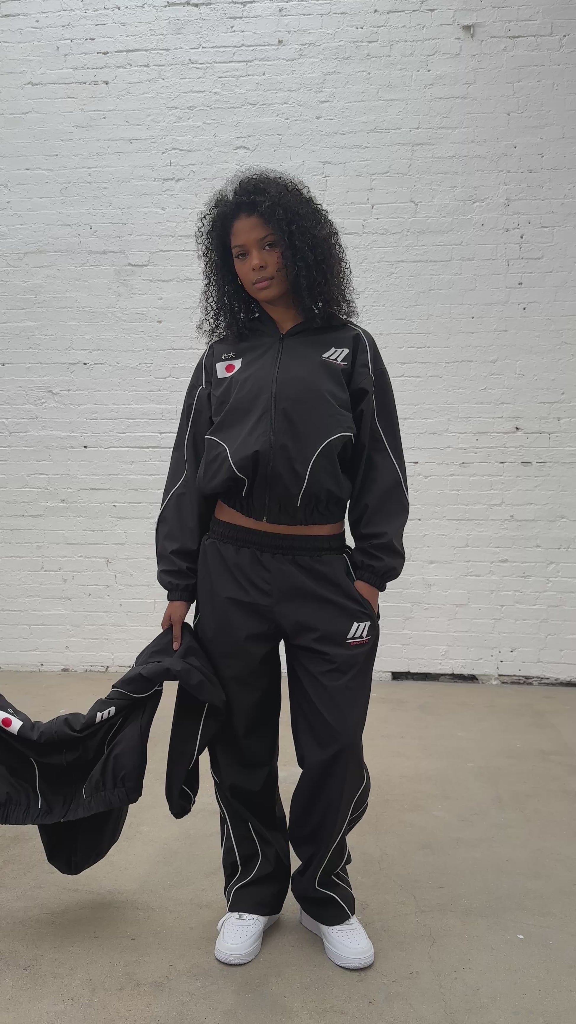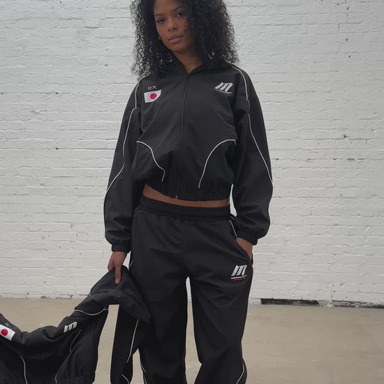 FEMALE MODEL: 5’8 WEARING SMALL TRACK JACKET.